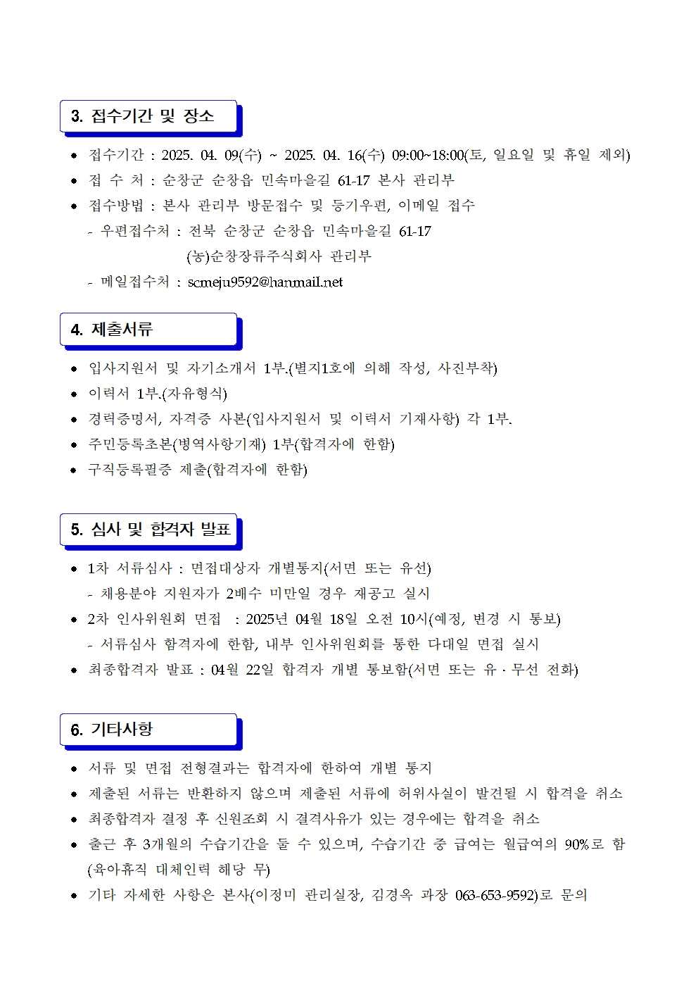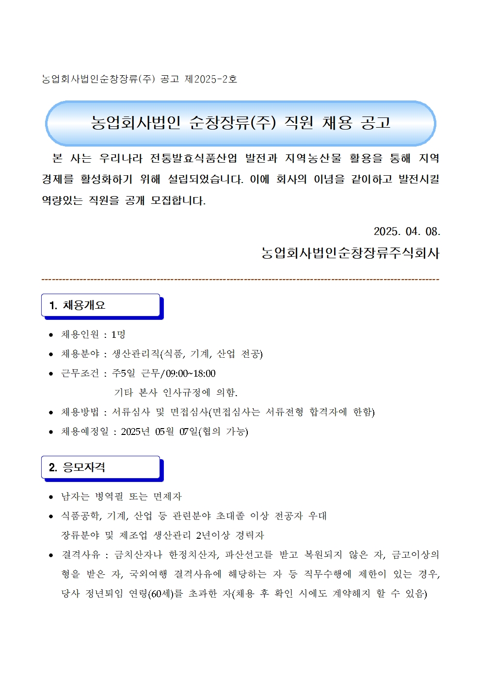농업회사법인 순창장류(주) 직원 채용 연장공고