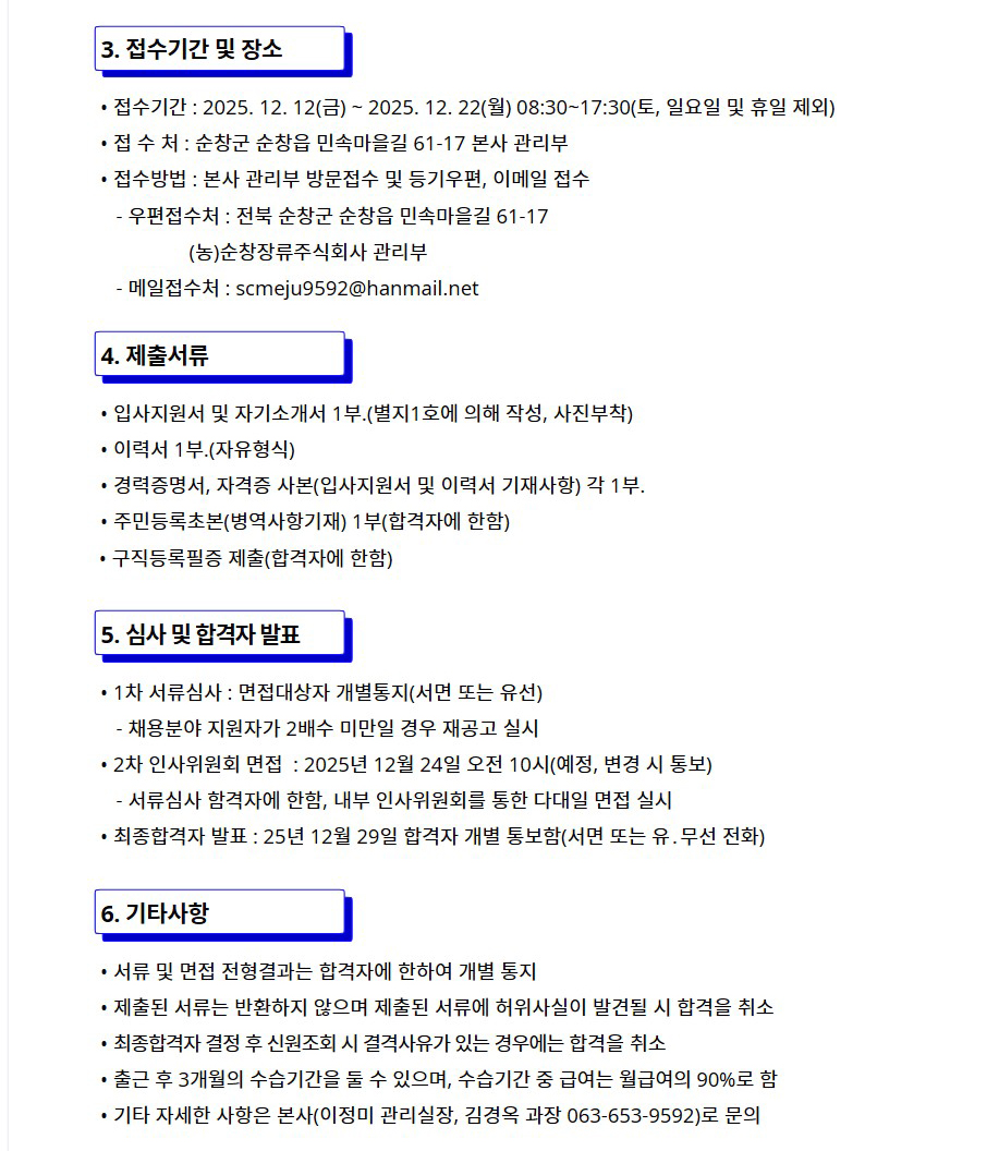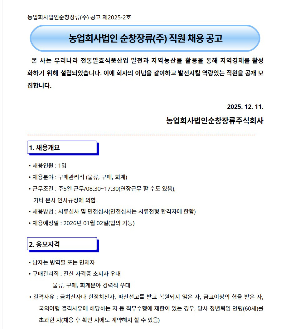 농업회사법인 순창장류(주) 직원 채용 연장공고